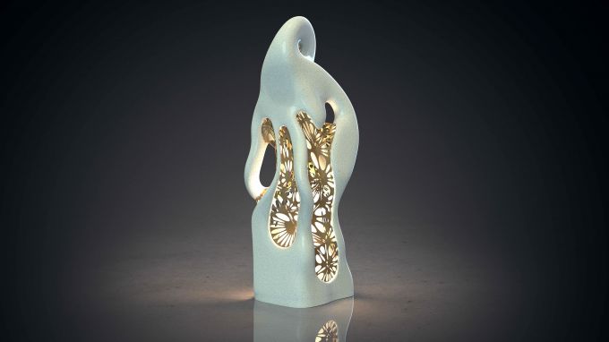 一款便携式居家室内外灯具,通过抽象流淌的形来表达作品造型。作品外壳材料为陶瓷外壳,镂空效果突出光感,提高灯具氛围感。顶部圆洞镂空也提高了多场景使用性,使设计感与使用性达到统一。