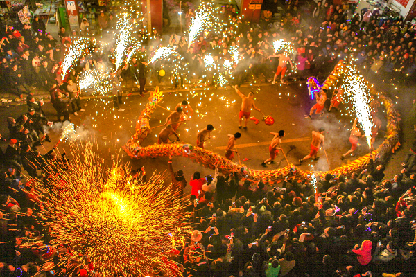 万点“星火”洒向龙身,围观人群无一不为此景欢呼雀跃。大家用掌声致敬这浴火的浪漫,用欢呼声迎来一年中最重要的节日——春节。